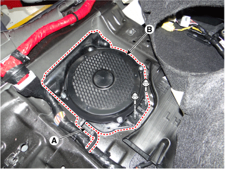 Снимите низкочастотный динамик (B) после отсоединения разъема (A). и ослабление болтов крепления.
