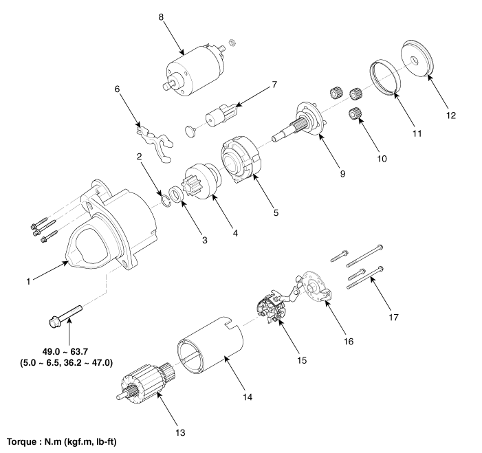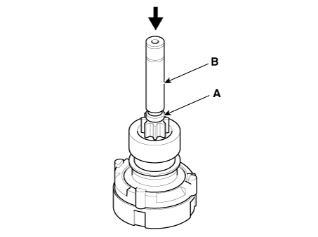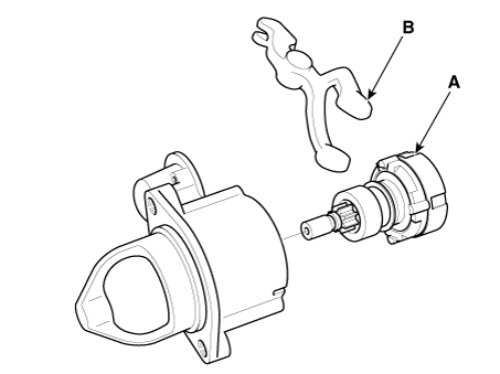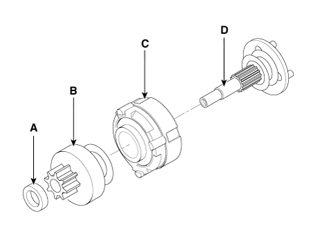 Если ведущая шестерня стартера изношена или повреждена, замените обгонную муфту. сцепление в сборе. (шестерня отдельно не продается) Проверьте состояние зубчатого венца маховика или гидротрансформатора, если повреждены зубья ведущей шестерни стартера. |
