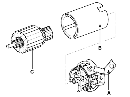 С помощью омметра проверьте отсутствие непрерывности между коллектором (A) и сердечником катушки якоря (B), а также между коммутатором и якорем вал (С). При наличии непрерывности замените якорь.