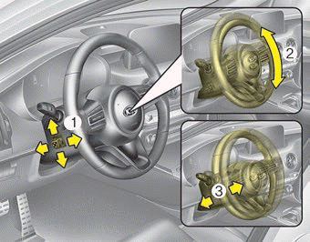 Отрегулируйте угол наклона рулевого колеса (2) и положение (3) с помощью переключателя (1) на рулевая колонка. Поверните руль так, чтобы он указывал на грудь, а не на твое лицо. Убедитесь, что вы видите сигнальные лампы и датчики на приборной панели.