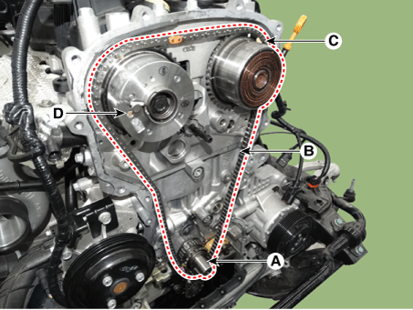 Установите цепь привода ГРМ. Для установки цепи привода ГРМ без провисания для каждого вала (кулачкового, кривошипного) выполните следующую процедуру. Звездочка коленчатого вала (A) → Направляющая цепи ГРМ (B) → Впускная звездочка CVVT (C) → Выпускная звездочка CVVT (D).