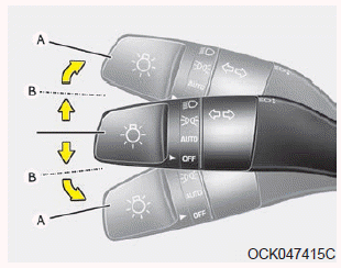 Для работы указателей поворота ключ зажигания должен быть включен. Чтобы включить сигналы поворота, переместите рычаг вверх или вниз (A). Зеленые стрелки на приборе панель показывает, какой сигнал поворота работает.