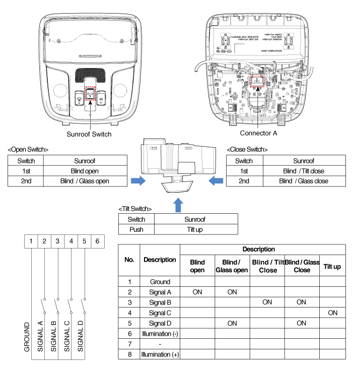 Проверьте целостность цепи между клеммами. Если непрерывность не показано, как указано, замените переключатель широкого люка.