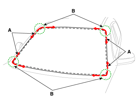 Упакуйте клей в картридж без воздушных карманов, чтобы обеспечить непрерывную работу. доставка. Загрузите картридж в пистолет для герметика и нанесите каплю клея. (B) вокруг края ветрового стекла (A) между застежкой и молдинг, как показано. Нанесите клей в течение 30 минут после нанесения грунтовка для стекла. В каждом уголке сделайте бусину чуть толще.