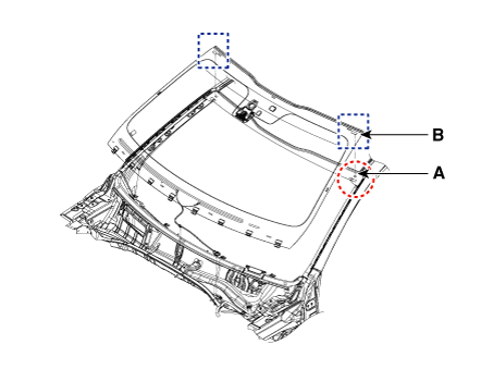 Снимите ленту с молдинга ветрового стекла (А) и установите молдинг на лобовом стекле (B).