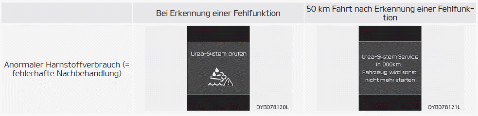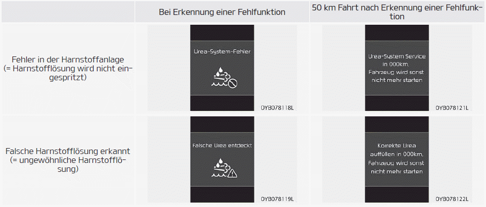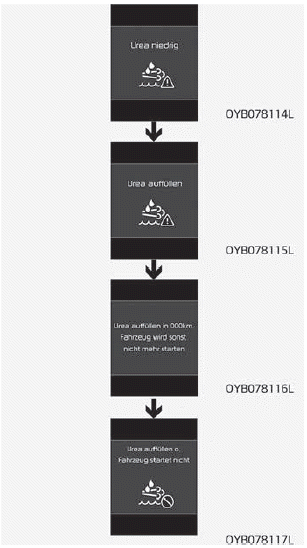 Если появляется сообщение «Низкий уровень мочевины» или «Долейте мочевины» (слишком мало мочевины или долить мочевину) отображается, необходимо иметь достаточное количество раствора мочевины быть добавлено. Если они Сообщение «Долейте мочевину через 000 км или автомобиль не заводится" (мочевина на 000 км долить или машина не заводится больше), заполните соответствующее количество раствора мочевины после.