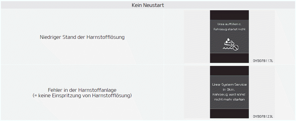 После системы подсказок окончательный статус достиг и перезапуска Транспортное средство предотвращено, система может только путем доливки раствора мочевины в баке мочевины или утилизации неисправностей отключено становиться. Если автомобиль после Сообщение «Заполните бак мочевины или автомобиль не заводится» (заполните бак мочевины или автомобиль больше не заводится). больше можно перезапустить, заполнить достаточное количество раствора мочевины после, подождите несколько минут а потом попробуй машину Заново. Если само транспортное средство независимо от уровня мочевины заведите, оставьте автомобиль в проверено специализированной мастерской. Киа рекомендует обратиться к авторизованному дилеру Киа/ связаться с сервисным партнером.