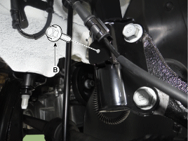 Болт кронштейна шланга суппорта (A) и болт кронштейна датчика скорости вращения колеса (B). отвинтить.
