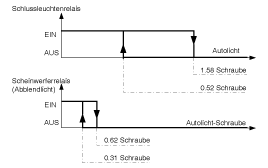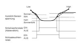 Возникновение ошибок: когда возникает ошибка в функции автомобильного освещения, фара должна быть включена независимо от преобладающего солнечного излучения становиться. Это чтобы фары не выключались если есть неисправность функции автоматического освещения в ночное время. |