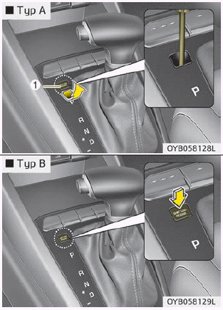 4. Установите рычаг селектора в Нейтральный [N], пока вы нажать на педаль тормоза и Кнопка [РАЗБЛОКИРОВКА ПЕРЕКЛЮЧЕНИЯ] (решение для рычага селектора) нажмите или одновременно инструмент (например, шлицевая отвертка) в Отверстие для доступа к [SHIFT LOCK RELEASE] и вниз нажимать. Тогда автомобиль может быть подтолкнуть.