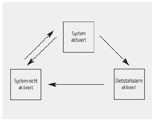 Система предназначена для против несанкционированного доступа к транспортному средству защищает. Система работает в трех состояния: первое состояние «активировано», второе состояние - "воровство- Тревога», а третье состояние «Система отключена». Если поездка происходит, система дает акустический Будильник и переключатели одновременно горят аварийные огни.