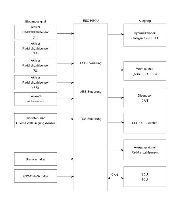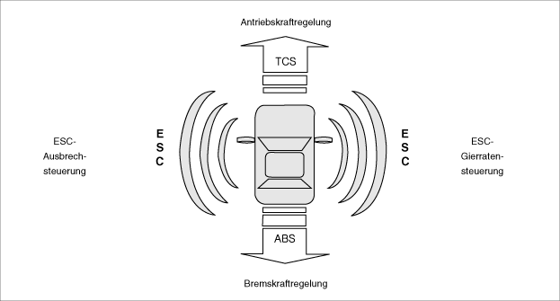 Электронный контроль устойчивости (ESC) обнаруживает опасные дорожные ситуации такие как панические реакции в опасных ситуациях и стабилизирует транспортное средство путем торможения отдельных колес и вмешательства в управление двигателем.