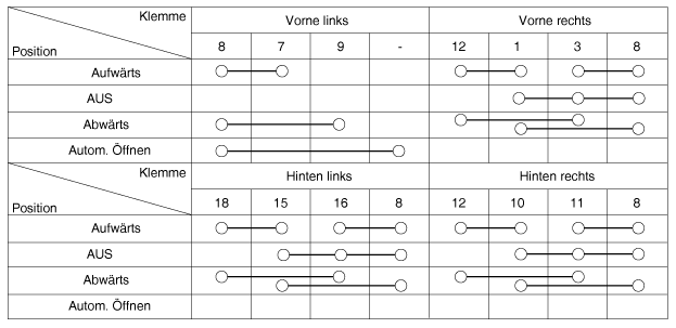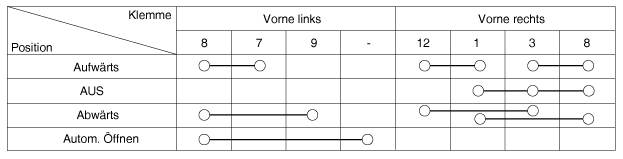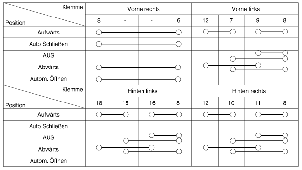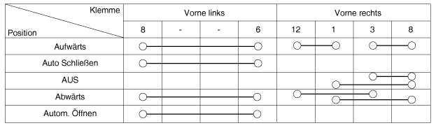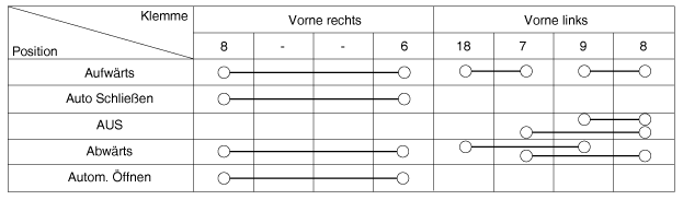 В отдельных положениях переключателя в соответствии со следующей таблицей для непрерывности проверьте между клеммами. Если непрерывность электричества нарушена есть, замените переключатель. [Защитное окно водителя спереди/сзади — автоматическое закрытие/открытие] (левый руль)