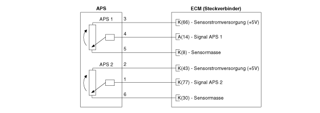 Датчик педали акселератора (APS) прикреплен к модулю педали акселератора и определяет угол поворота педали газа. Поскольку APS является одним из самых важных датчиков в управлении двигателем. То есть он спроектирован дважды с отдельными линиями питания и заземления. второй датчик контролирует первый датчик, и его выходное напряжение вдвое меньше большой, как у первого. Если соотношение между датчиками 1 и 2 выходит за пределы диапазоне допустимых значений (примерно в два раза меньше), диагностическая система обнаруживает неисправность.