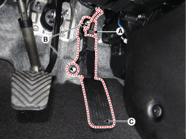 Ослабьте крепежный болт (C) и гайки (B), а затем модуль педали акселератора. Удалять.
