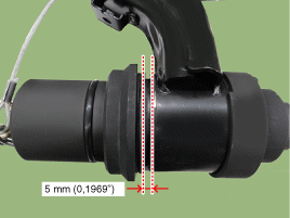 Поворачивая главный винт (А) по часовой стрелке ударным гайковертом Соберите так, чтобы между втулкой и осью торсиона был зазор 5 мм. состоит. Во время этой операции визуально проверяйте через отверстие в крышке (B). разводится ли мать. Если гайка ослабнет, используйте указанную затяните крутящий момент.