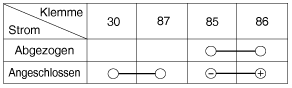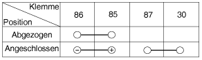 После отключения питания между выводами реле №. 85 и 86 убедитесь, что между клеммами № 30 и 87 существует.