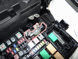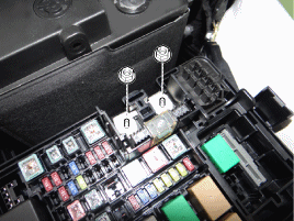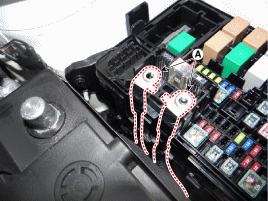 Отверните гайки блока предохранителей и реле в моторном отсеке, затем зажимы кабеля питания. (А) удалить.