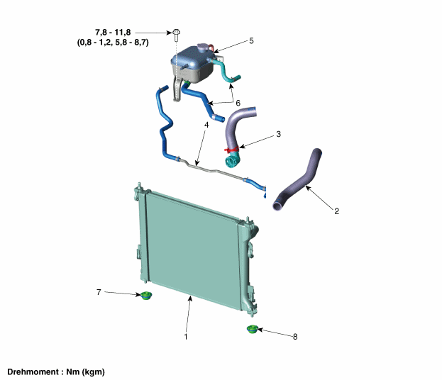 6. Шланг расширительного бачка 7. Нижняя опора радиатора [D] 8, нижняя опора радиатора [G] |
