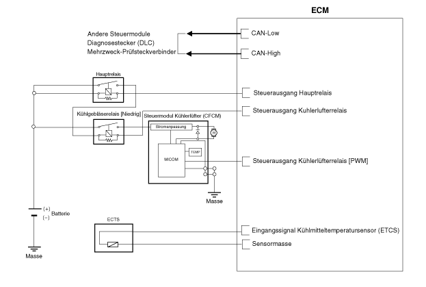 Вентилятор охлаждения работает в 1 ступени (ВЫСОКАЯ). Модуль управления двигателем (ECM) управляет вентилятор радиатора в зависимости от температуры охлаждающей жидкости, скорости автомобиля и работу кондиционера.