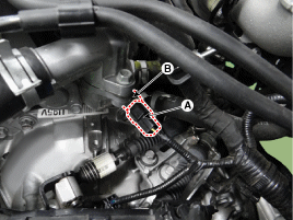 Снимите датчик температуры охлаждающей жидкости (В).