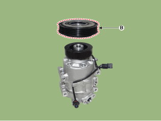Проверьте зазор в подшипнике и сопротивление шкива (В), повернув шкив поворачивается вручную. Замените комплект сцепления при чрезмерном люфте если чувствуется сопротивление или возникает чрезмерный шум при повороте.
