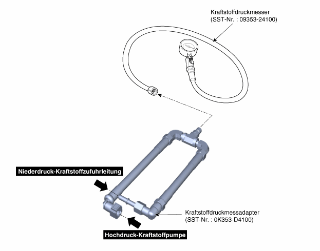 На штуцерах по линии подачи топлива, линии подачи и компоненты SST на утечку топлива при включенном зажигании. тест. |