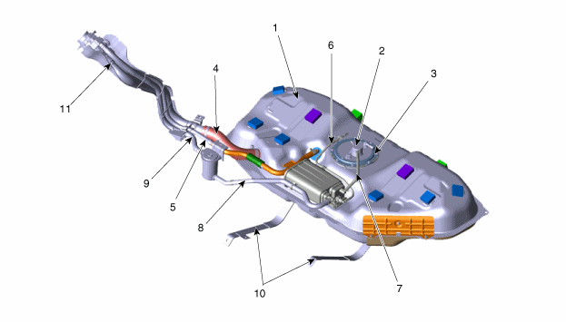 8. Паровой шланг (угольный фильтр → воздушный фильтр) 9. Паровой шланг (воздушный фильтр → давление воздуха) 10. Ремень топливного бака 11. Заливная горловина |