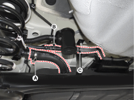 Шланг наполнения бака (A), компенсационный шланг (B) и шланг на адсорбере с активированным углем (С) отклеить.