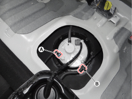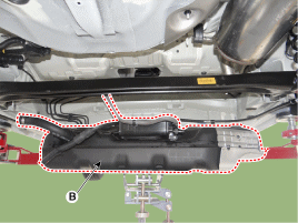 Снимите гайки крепления топливного бака (А) и топливный бак. (В) вынуть.