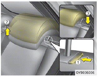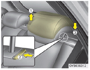Um die Kopfstütze in eine höhere Stellung zu Bringen, ziehen Sie bis in die gewünschte Stellung nach oben (1). гм die Kopfstütze in eine tiefere Stellung цу принес, drücken Sie die Sperrtaste (2) an der Kopfstützenaufnahme, halten die Taster gedrückt und drücken dabei die Kopfstütze bis in die gewünschte Stellung nach unten (3).
