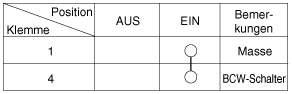 Den BCW-Schalter betätigen und auf Durchgang zwischen den Klemmen des BCW-Schaltersteckverbinders prüfen.