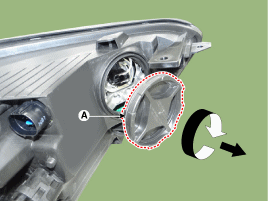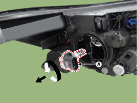 Nach Drehen entgegen dem Uhrzeigersinn die Fern-/Abblendlicht-Glühlampe (A) aus der Scheinwerfereinheit entfernen.