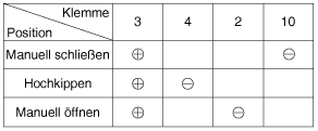 Klemmen entsprechend der folgenden Tabelle an Masse legen und prüfen, ob die Schiebedachbewegungen der Tabelle entsprechen.
