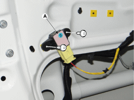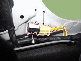 Steckverbinder (A) des Seitenaufprallsensors abziehen und Schraube (B) lösen, dann Sensor entfernen.