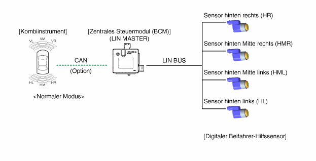 Wird ein Gegenstand vom PDW-R-Sensor erfasst, wird eine akustische Warnung, z.B. mit einem Warnsummer ausgelöst. Der PDW-R-Sensor sendet die Daten über LIN-Communikation an das BCM, und das BCM sorgt für die Ausgabe der akustischen Warnung für den jeweiligen PDW-R-SENSOR имеет приоритет. Wird ein Anzeige-Alarm an den Instrumentenblock gesendet, dient das BCM nur als Gateway.