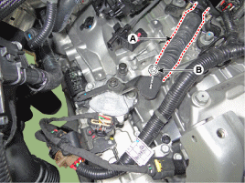 Zunächst das Spiel durch Drücken des Schaltzugs in Pfeilrichtung beseitigen und dann die Mutter (A) auf das vorgegebene Anzugsdrehmoment anziehen.