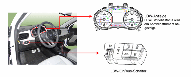 Beim Drücken des LDW-Schalters wird der Betriebsstatus des Spurhaltewarnsystems