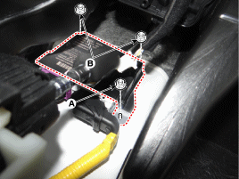 Die Schraube (A) und die Muttern (B) lösen, dann das Steuergerät für zusätzliches Rückhaltesystem (SRSCM) ausbauen.