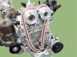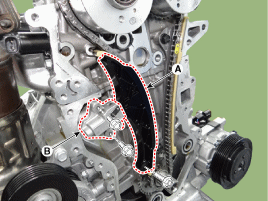 Spannerhebel (A) der Steuerkette и Steuerkettenspanner (B) einbauen und dann den Passstift entfernen.