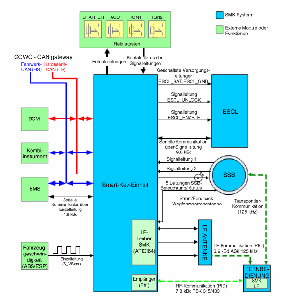 SMK managt die mit der "Klemmensteuerung" Verbundenen Funktionen, indem externe Relais für ACC, IGN1 и IGN2 aktiviert werden. Diese Einheit ist außerdem für die Steuerung des ANLASSER-Relais verantwortlich.