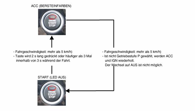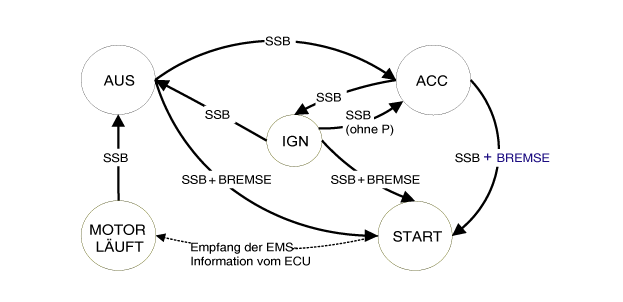 Der wesentliche Unterschied von einem System, das auf einem mechanischen Zündschalter basiert, besteht darin, dass das BES-System einen speziellen Übergang von [OFF] nach [START] ermöglicht, ohne die Zustände [ACC] und [IGN] zu durchlaufen.