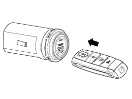 Bei einem Fahrzeug mit SMART-KEY-System muss der Fahrer nichts unternehmen, гм die Fernbedienung zu authentifizieren. Bei einem Notstart oder bei einem Fahrzeug ohne SMART KEY muss der Fahrer die Fernbedienung in den Fernbedienungshalter einsetzen.