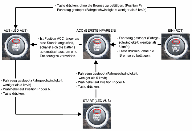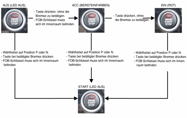 Änderung des Status der Motorzündung und des Stroms durch Verwendung des Startknopfes. |