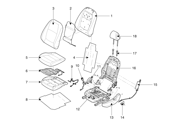 11. Внутреннее Vordersitzabdeckung 12. Фордерзицпольстерахмен 13. Äußerer Vordersitzbezug 14. Lehnenverstellknopf des Vordersitzes 15. Модуль подушки безопасности Vordersitz-Seiten (SAB) 16. Фордерзитцлененрамен 17. Фордерситцкопфштютце 18. Фордерситцкопфштютце |