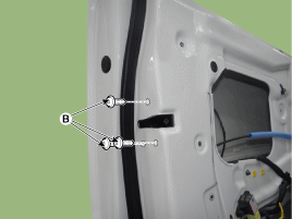 Befestigungsschrauben (B) lösen, dann Vordertürschlossfalle (A) ausbauen.