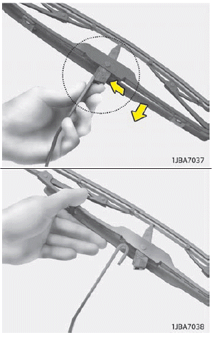 2. Drücken Sie die Klammer zusammen und schieben Sie das Wischerblatt нах унтен.