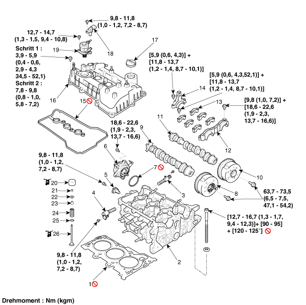 11. Эйнласс-Ноккенвелле 12, Нокенвеллен-Лагердекельворн 13, Миттлерер Нокенвелленлагердекель 14, Хинтерер Нокенвелленлагердекель 15, Вентильдекельдихтунг 16. Цилиндеркопфдекель 17, Оляйнфюльдекель 18, Сенсор Эйнласа-Ноккенвелла (CMPS) |