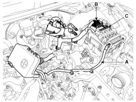 Отсоедините кабель (+) (A), разъем блока предохранителей (B), блок EMS (C) и