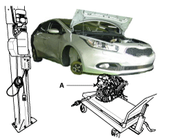 Снимите двигатель и коробку передач в сборе (А) в направлении вперед.
